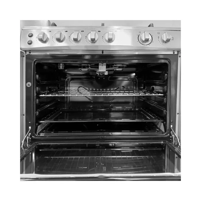 | COCINA DE 5 HORNALLAS ACERO INOXIDABLE DE ALTA RESISTENCIA -Tamaño 760x580x900MM 95 L. -Puerta del horno plano de vidrio -Rejilla reforzada -Cubierta superior de vidrio -Encendido electrico -Doble entrada de GAS Izquierda/Derecha -Luz en el horno -Temporizador - Grill superior -Asador/ Rostizador giratorio -Tipo de gas - GLP/GNV -Voltaje 220-240V- 50Hz-60Hz -Potencia 29W -Categoria I3 B P -Presion de Gas 28-30 mbar -Potencia entrada de gas 15.okW Accesorios en el horno -2 rejillas -1 bandeja deslizante -1 bandeja de goteo |
